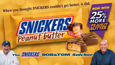 Just when you thought SNICKERS couldn’t get better, it did! SNICKERS Peanut Butter Squared now has 25% MORE peanut butter! Share a square with a friend while laughing along with the BOB & TO...